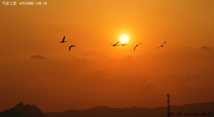 ▼天鹅湖的东边有一座小山,太阳藏在小山后边。