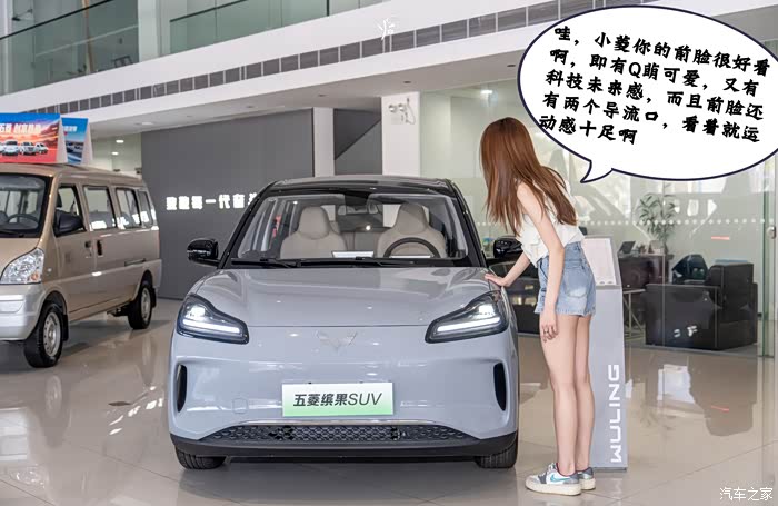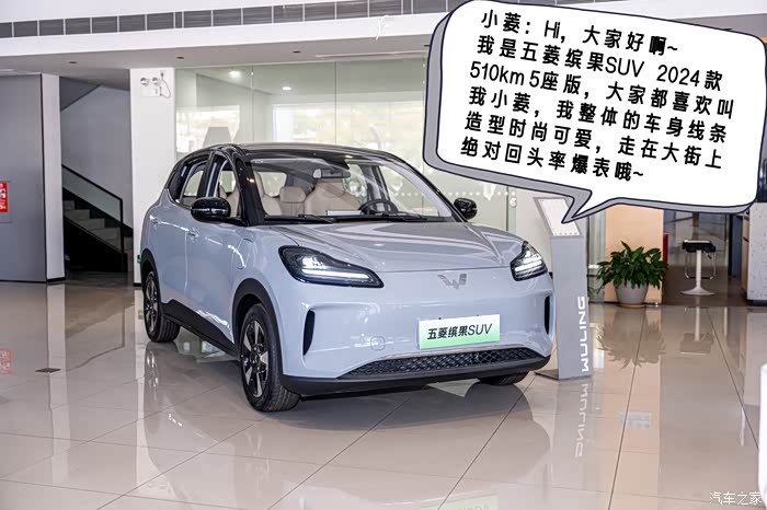 一进大门,PD小姐姐就看到了一台萌萌哒,颜值爆表的小可爱,没错,这就是我们此次要了解的车子,五菱缤果SUV 2024款 510km 五座版