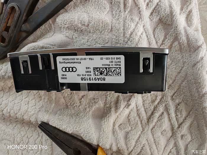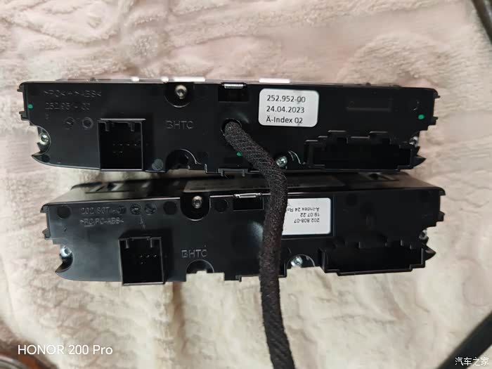 副厂比原厂便宜的另一个重要原因就在此,副厂是用原厂的面板修改的,额外加了电路板和加热按键。原厂空调面板是集成在一起的,也没有这个大尾巴,端子也更多一些。零件号自然也不一样。