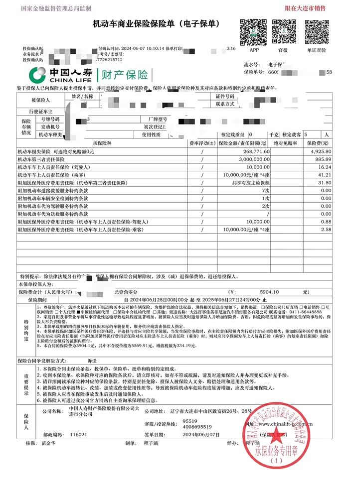 我办的是人寿保险,车损➕三者 300 万➕座位险➕驾乘险,一共是 5904 元,车险销售返了 500 元的油卡,送了 6 次代驾,每个月 2 次免费洗车。
