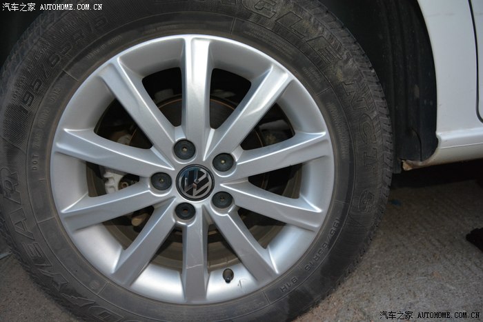 侧面可以很清晰的看到轮毂的造型,12款宝来时尚型的是5幅轮毂,而舒适型的则改为了10幅的轮毂,更加好看,轮胎为195/65 R15,只能算一般配置,相比13款的205来说差了一点。