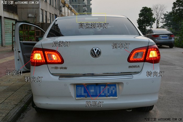 再看看性感屁屁上的灯光:刹车没拉起,所以刹车灯和高位刹车灯没有亮起。宝来的设计,后雾灯和倒车灯都只有一个,分列左右,很多人以为这是因为灯坏了,这下可以放心了吧?