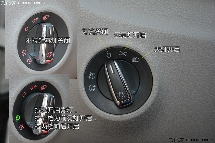 小灯和大灯好开,转到指定位置就可以了,而雾灯,则有不少人问起雾灯怎么开,大众车系的设计都是在开启灯光的状态下,往外拉开关可以打开雾灯,拉起一档为前雾灯开,拉起两档为前后雾灯开。