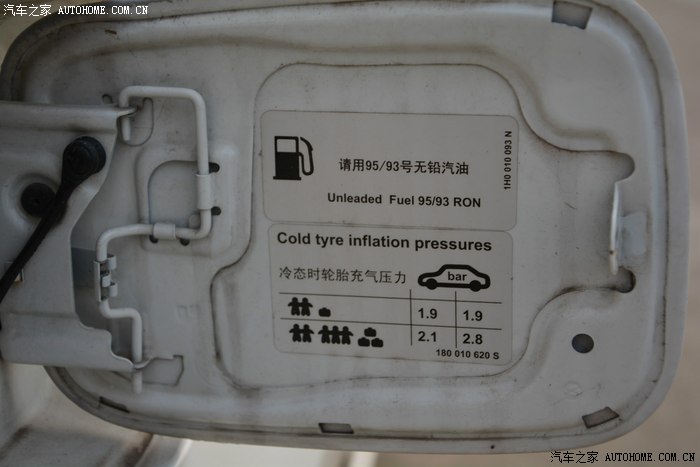 打开油箱盖,里面有燃油标号标识,咱吃93号就可以啦;还有胎压说明,供大家参考。