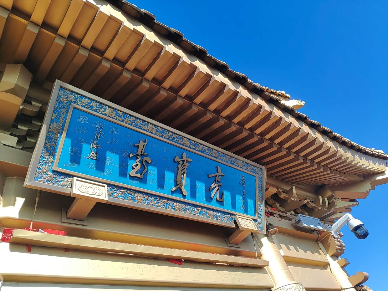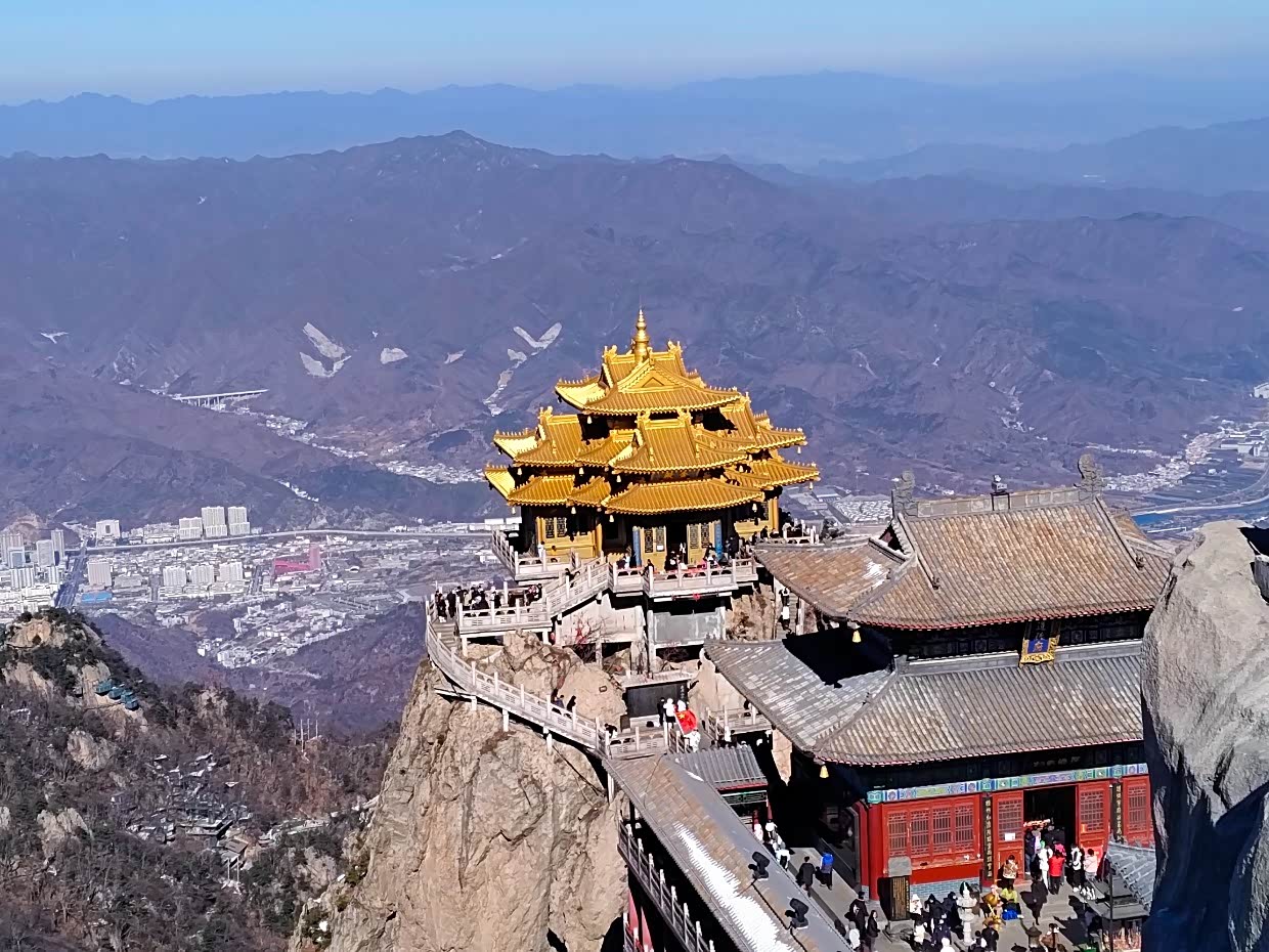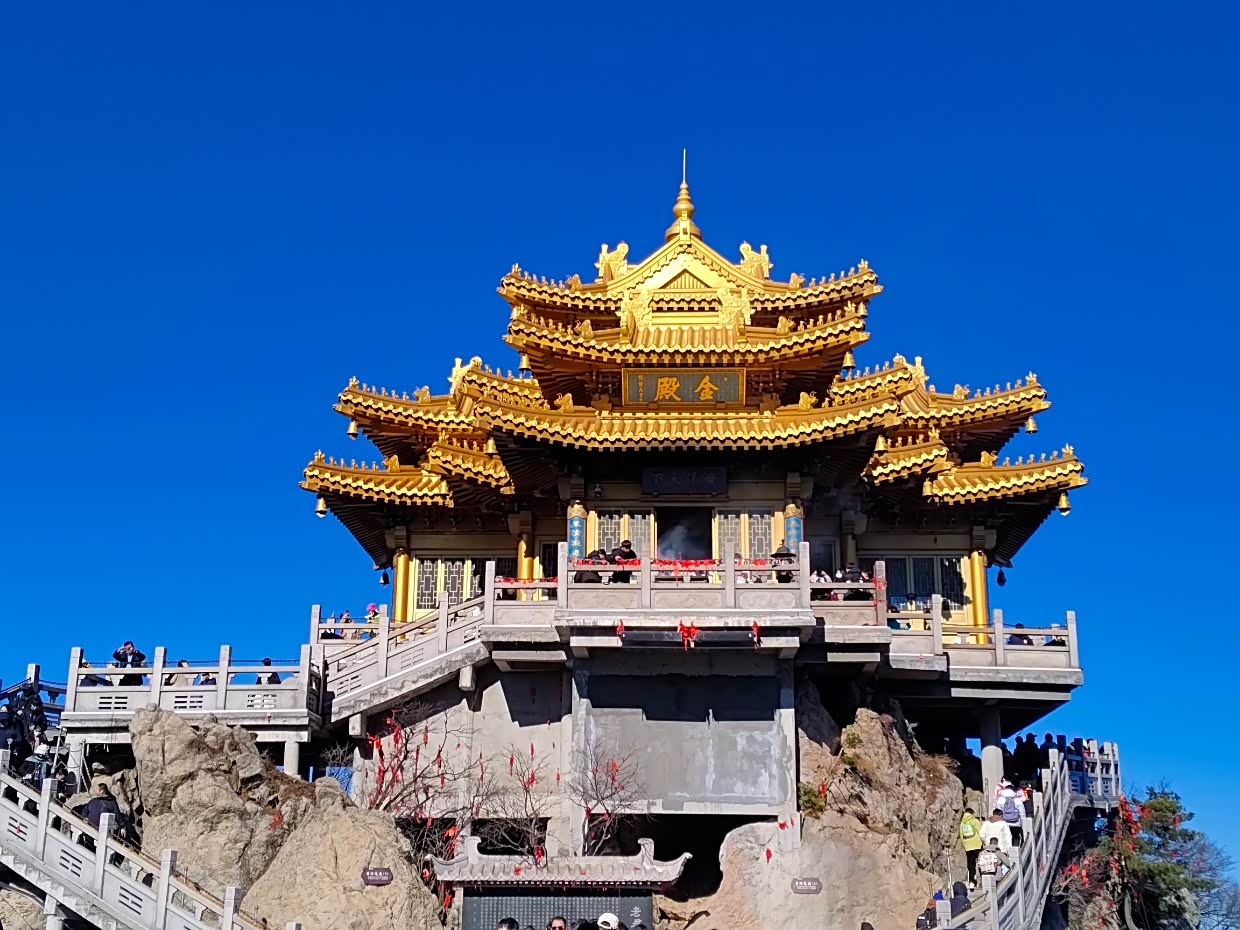 金顶道观群一共五座道观,中间的老君庙和道德府,隔了一座桥的是金殿,另一侧是遥遥相望的玉皇顶和多宝台。玉皇顶和多宝台上去的台阶很窄很陡峭,人很多,需要借助铁链攀登。玉皇顶和多宝台也是拍摄金顶亮灯的最佳位置。