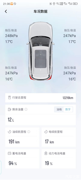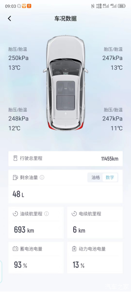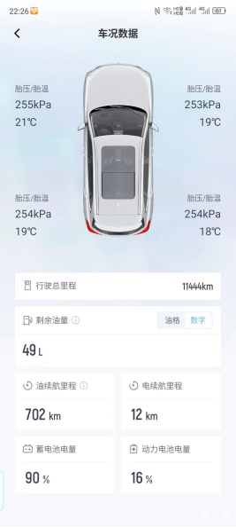 全天共行驶634公里,同样前期模式设置为智能混动强制保电52%并打开智慧巡航,后期根据剩余里程切换为纯电模式,最后剩余纯电续航里程12公里,电续航里程为184-12=172根据里程表全天行程共计893公里,通过油表粗略计算油耗约为百公里5.19升,计算公式为(49-25)/(638-172)=5.19升。