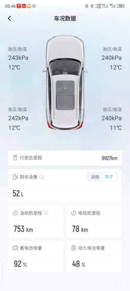 全天共行驶764公里,这次前期模式设置为智能混动智能并打开智慧巡航,后期根据剩余里程切换为纯电模式,最后剩余纯电续航里程17公里,电续航里程为155-17=138,通过油表粗略计算油耗约为百公里5.75升,计算公式为(48-12)/(764-138)=5.75升。平均油耗较前两段行程略偏高,估计受电量不满和堵车影响。