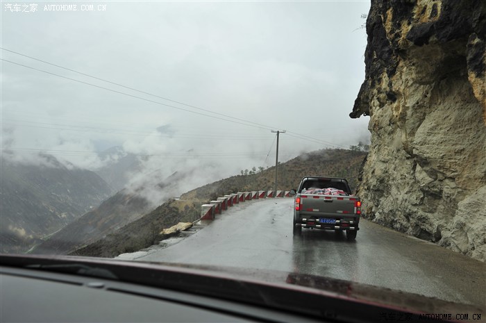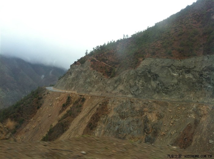 上到山顶后一路下坡,白雪逐渐消失换做大雾随后演变为淅淅沥沥的小雨,满目青山逐渐露出秀丽面目,云雾缭绕、含羞欲滴、遮遮掩掩让看客是欲罢不能,行进于此山间,小森犹如闪电般迅捷,转弯抹角之处又绝不拖泥带水,2.5小心脏灵敏无比,操控不敢说比拟豪车,但绝对指哪打哪,四速的变速器笨拙却又机灵,低扭矩时候的及时响应快捷无比,急加速的轰鸣、肾上腺素的急剧攀升,人车合一、游戈嬉戏于山间可谓游刃有余,谁知好景不长,随着山势的急剧下滑,路面状况出现危险变化,左侧山涧越来越深,山峰越来越高,原本行驶在山顶的快感也随之降到谷底,一侧万丈悬崖,一侧滚石满地,道路上全是乱七八糟的滚石,小森游戈穿梭于乱石之间,可说险象环生,此时我和小宝有了分工,他负责监视山上的情况,一旦有滚石、有泥沙飘下就及时的告知,以便我驾驶时全心应对路面之复杂又可以随时掌握右侧山体情况,就这样,一百多公里的滚石路段我们全然是在躲闪石块中熬过,期间小森的底盘没有一次刮伤,下车清理乱石N次,由于小宝和我处于高压紧张状态,这一百多公里都忘记拍照,最可怜的是后面的奔驰三角裤,沿途托底无数次,那个心疼呀。。。。。。不过也好在有惊无险大家人车安然通过,这就是滇藏线,昔日的茶马古道。那危险绝不逊于318,真正体会了一把上有滚石下有深渊,中有乱石挡道的惊险。