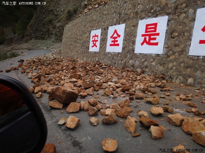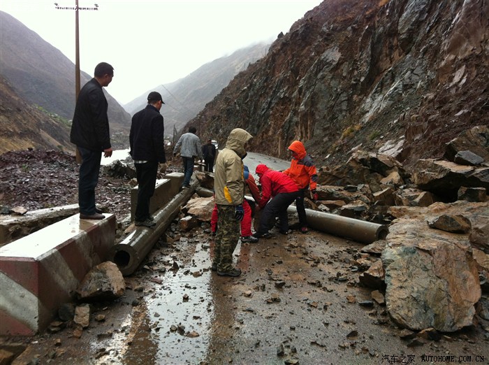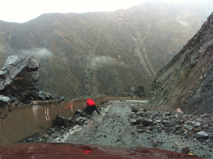 电线杆子都被山上滚下的大石头砸碎,每块石头重达千斤,别无他法,随我一起冲出重围的几辆车合起来人工开搬,准备用小的乱石在大的石头上面铺出一条康庄大道,我就不信有人干不成的事,任何艰难险阻都阻挡不住前行的决心。