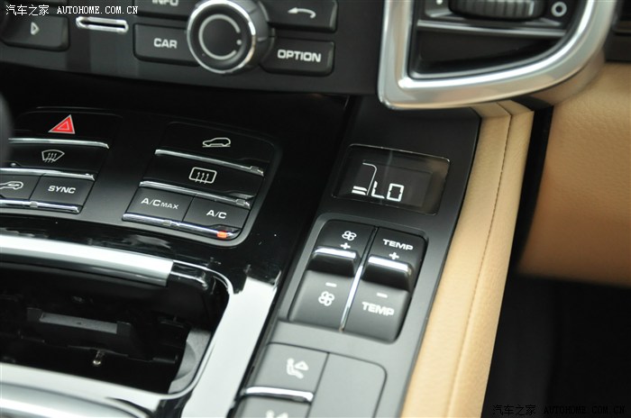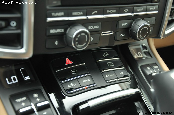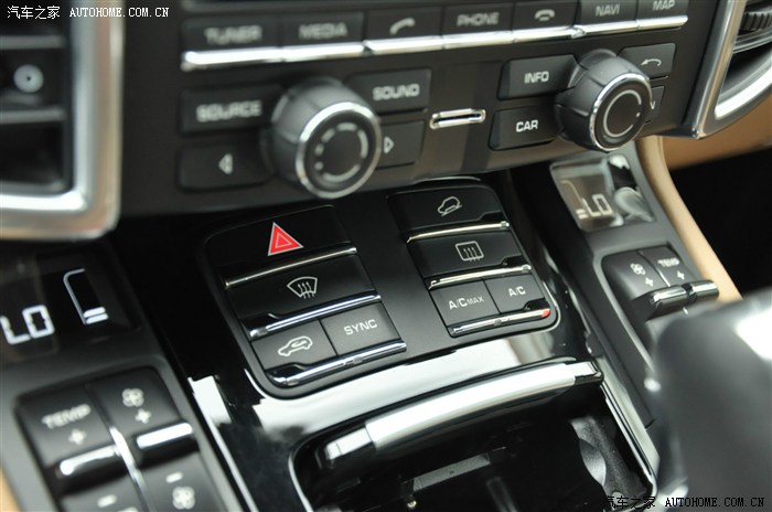 这个区域从左到右从上到下分别是 紧急双闪等开关,陡坡缓降,前玻璃吹热风,后玻璃吹热风,内循环开关,现在亮的SYNC,功能就是按下这个键之后其他3区空调就自动和驾驶座空调设置一样,就叫它听 档 指挥键吧,以及压缩机最大开关和普通开关。在这里吐槽一下铂金卡宴,没有标配玻璃加热很操蛋。