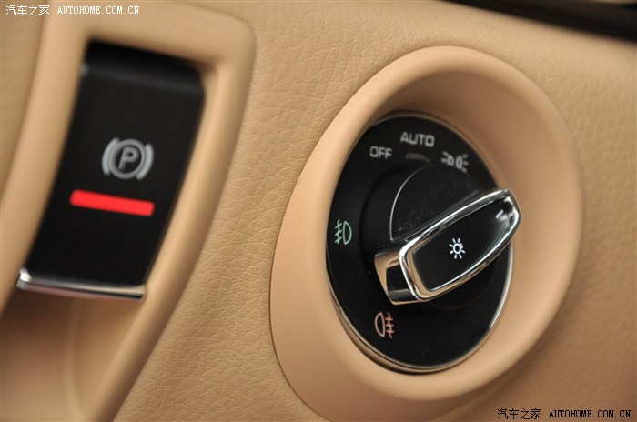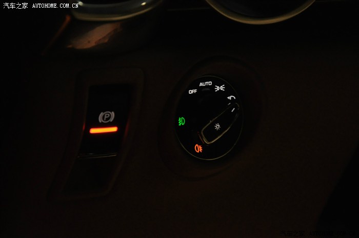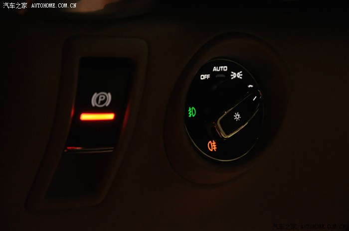 这个是电子手刹和大灯开关,这里重点讲的是前后雾灯的打开方法:如图,必须得先把开关拧到最右,然后向上提起就好了。这个角度可以很明显的看到开关的中间圆柱部分是冒出来的。