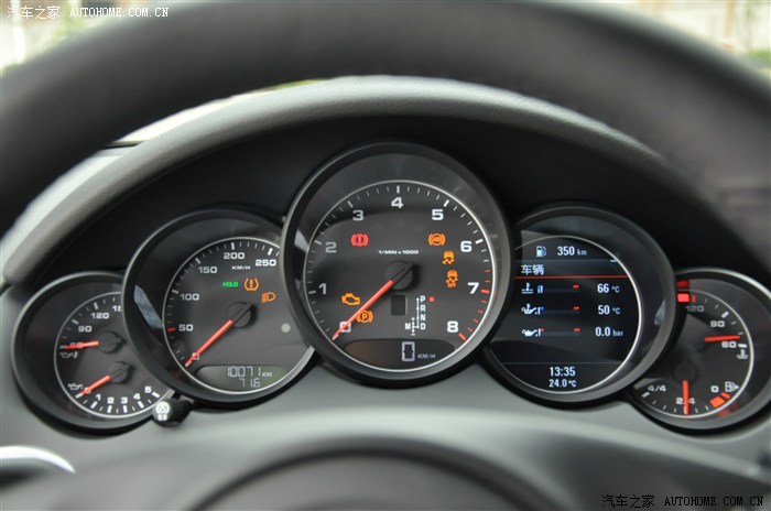 经典的5炮筒,很漂亮,从左到右,从上到下依次是 机油温度,机油压力,速度表,转速表,行车电脑,水温表和油箱。我之前一直迷恋宝马的全液晶仪表,看了这个之后,我才理解 只要做的好,传统仪表才是王道。