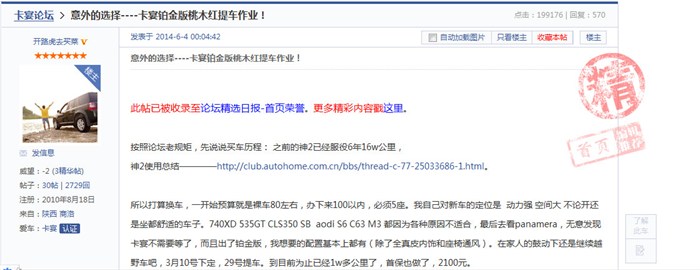 所以打算换车,一开始预算就是裸车80左右,办下来100以内,必须5座。我自己对新车的定位是 动力强 空间大 不论开还是坐都舒适的车子。740XD 535GT CLS350 SB aodi S6 C63 M3 都因为各种原因不适合,最后去看panamera,无意发现卡宴不需要等了,而且出了铂金版,我想要的配置基本上都有(除了全真皮内饰和座椅通风)。在家人的鼓动下还是继续越野车吧,3月10号下定,29号提车。到目前为止已经1w多公里了,首保也做了,2100元。