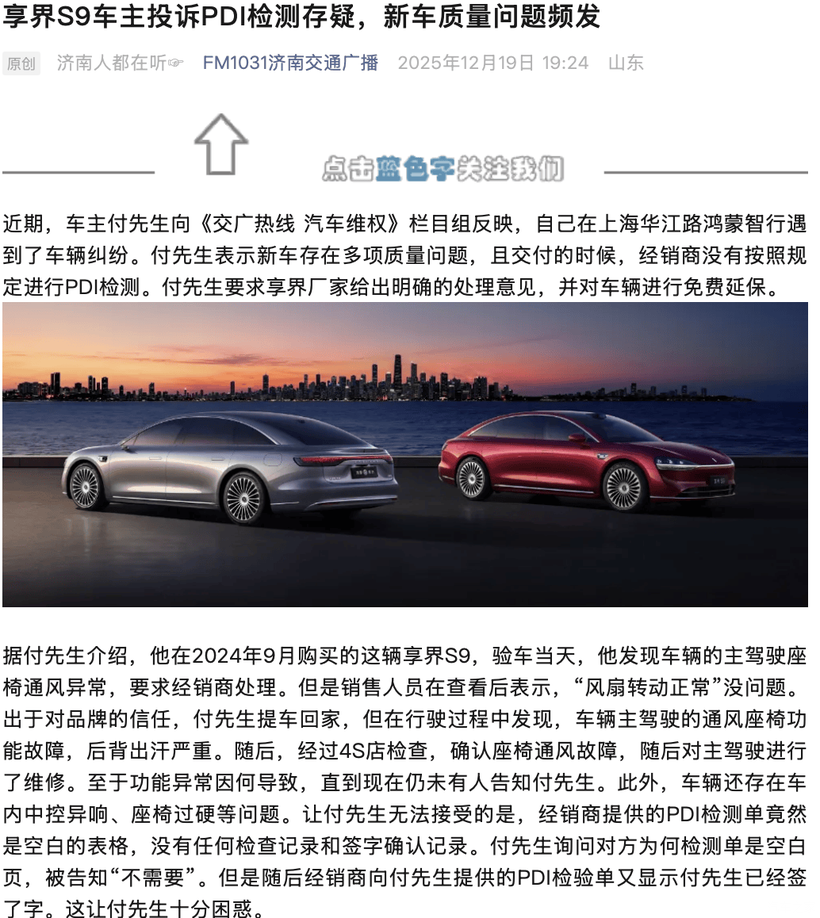 据FM103.1济南交通广播《交广热线 汽车维权》栏目组报道,故事的主角付先生,本怀着对享界品牌的信任与期待,于2024年9月在上海华江路鸿蒙智行购买了一辆享界S9。然而,这辆新车却从一开始就给他带来了无尽的烦恼。验车当天,付先生就发现车辆主驾驶座椅通风功能异常,但销售人员却轻描淡写地表示“风扇转动正常”,并无大碍。出于对品牌的信任,付先生选择了暂时隐忍,提车回家。