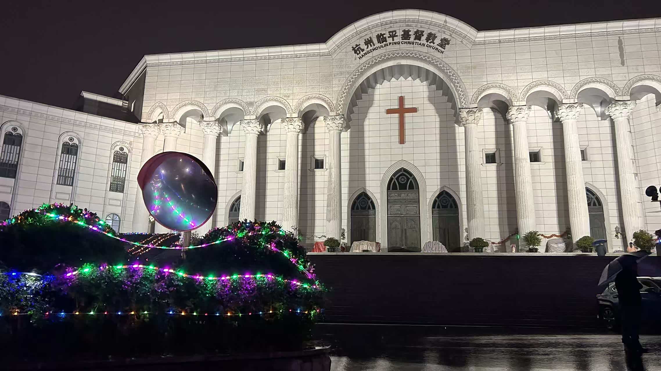 傍晚的雨,下得更猛了,倾盆大雨砸在车身上,噼啪作响,仿佛在叩问我们的决心。车队缓缓启程,雨水模糊了车窗,却让车身的国旗愈发鲜艳。途经基督教堂时,平安夜的静谧与巡游的庄重撞个满怀,两种截然不同的场景,却有着同样的内核——对和平的珍视。