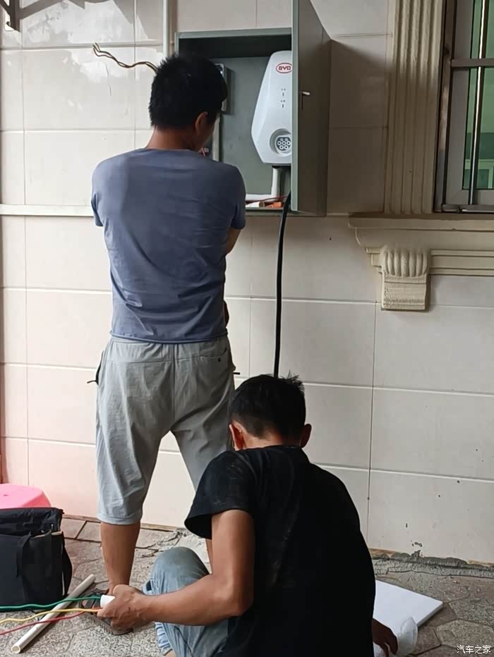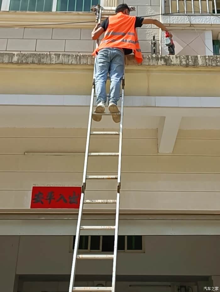 4.装好空开之后,充电桩师傅上门,因为我家要在高空走线,还测量了一下高度,超5米就要收费了,我的4.7米,电箱(尺寸长宽深60x50x25,比我这个大的尺寸都可以,图四效果,师傅告诉我官方的箱子也是得这样收纳线……)是我自己备的,建议到周围五金店购买哦,我这个60元,网上购买太贵啦,官方的也比较贵,但是安装电箱费用还是得出的,100元然后就是我家房子以前没有地线,还需要师傅额外打了个地线,150元。