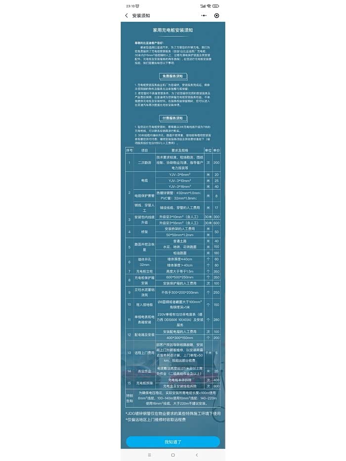 2.当天会接到比亚迪专员电话咨询确认各种事项: 确认是自建房安装还是小区安装,自建房安装的话会告诉你所需要的电表功率,让你先确认自家电表够不够大,我的是赠送7kw的充电机,要求220V,最大电流能支持35A 的电表,如果不够大或者想充电桩用电量独立计算的话,建议可以直接在南方电网公众号或APP(我这边是广东…)上面申请"用电报装"-"低压报装"去申请一个新的电表(现在电网都有新能源电费补贴哦),但是我不想等电网上门勘察现场再安装新电表,就用自己总电表操作了。