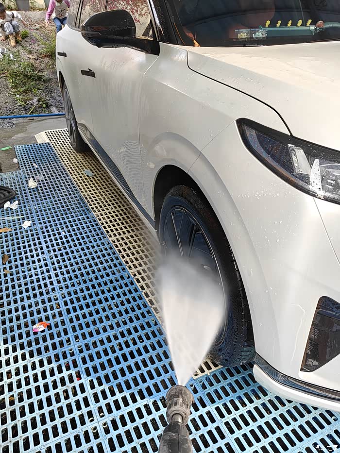 支付完成,我从设备中取出高压水枪。水枪启动,强大水流喷射而出,发出 “哗哗” 声响。儿子被这突如其来的声音吓了一跳,迅速躲到我身后,眼神中透着一丝害怕。女儿则满脸兴奋,急切地伸手想要尝试。我将水枪递给女儿,手把手教她握住水枪,控制水流方向。但清洗东风奕派 008 这样高大的车身并非易事,尤其是要冲洗到车顶行李箱,我不得不找来洗车点提供的垫高踏板,站在上面,调整水枪角度,才勉强能够到车顶。在冲洗过程中,我留意到车膜上有一些黑点,这些是长期积累的污渍,得仔细冲洗才能去除。同时,车身上还有几处树汁和鸟粪,我知道它们若不及时清理,会对车膜造成伤害,便着重用水枪冲击这些部位,确保清理干净。女儿在一旁看着,也努力模仿我的动作,认真冲洗车身侧面。儿子见状,也鼓起勇气,从我的身后探出脑袋,小心翼翼地伸出小手触碰水流,感受到水流的凉意后,脸上露出开心的笑容。清洗完车身大部分灰尘,我拿起泡沫枪。按下扳机,洁白细腻的泡沫如雪花般喷向车身,很快,整辆车被泡沫包裹,宛如一个巨大的奶油蛋糕。女儿和儿子看到这场景,兴奋得手舞足蹈,直接上手在车身上涂抹泡沫,小手划过之处,泡沫被抹出一道道痕迹。女儿沉浸在自己的创作中,用泡沫在车身上勾勒出爱心、花朵以及他们心目中小汽车的形状;儿子则带着满满的热情,努力将车身每一处都涂抹上泡沫,似乎想要把车打扮得无比漂亮。我在一旁看着他们,被他们的天真无邪逗得不禁笑出声来。