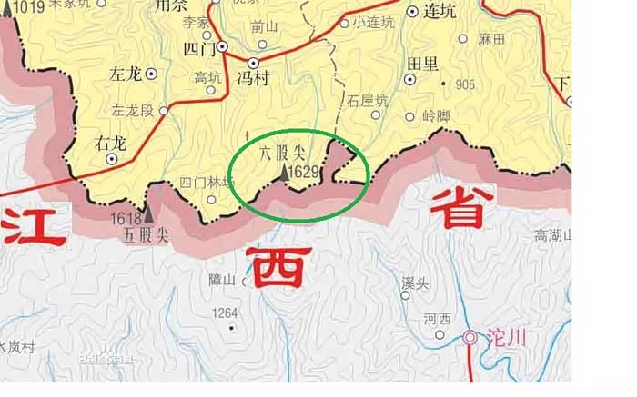 六股尖与五股尖都是钱塘江源头。从网上查获:六股尖又名鄣公山、三天子都。位于古徽州休宁县(今安徽省黄山市休宁县)鹤城乡冯村东南方与古徽州婺源县(今江西省上饶市的婺源)交界处,是怀玉山脉的最高峰,海拔1629.8米。东北坡为钱塘江正源―新安江的发源地,有“三江源头”(“三江”系指:新安江、富春江和钱塘江,它们的干流均在浙江省境内)之称。六股尖占地24平方公里,因主峰由六大支脉汇聚而成,故名。