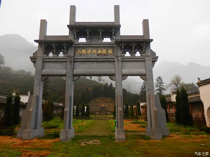 首先,需经过的是六股尖山脚下的无名英雄纪念碑。据记载:第二次国内革命战争时期,这里是我党红军皖浙赣边三年游击战争的中心区域。座落在六股尖北麓的石屋坑村曾是当时皖浙赣省委的常驻地之一。一九三五年十二月,红军独立团一个营在转战六股尖时,突遇暴风雪袭击,三十多名年轻的红军战士饥寒交迫,竟被活活冻死。他们有的坐在石头上,有的还保持持枪挺立的姿势,这些冰雪雕像在六股尖凝成悲壮的历史一幕,牺牲的红军战士姓名都无从考证。石屋坑的群众只能将他们就地掩埋。66年之后,公元二○○一年,安徽省休宁县委、县政府为缅怀英烈,斥资修建无名烈士碑,并将碑地选在一九三六年牺牲的四门区委书记花机关、区委委员谢兆先、余茂兴三位烈士墓后。新落成的无名烈士纪念碑呈半圆形,紧紧依偎着雄壮巍峨的六股尖山脉。