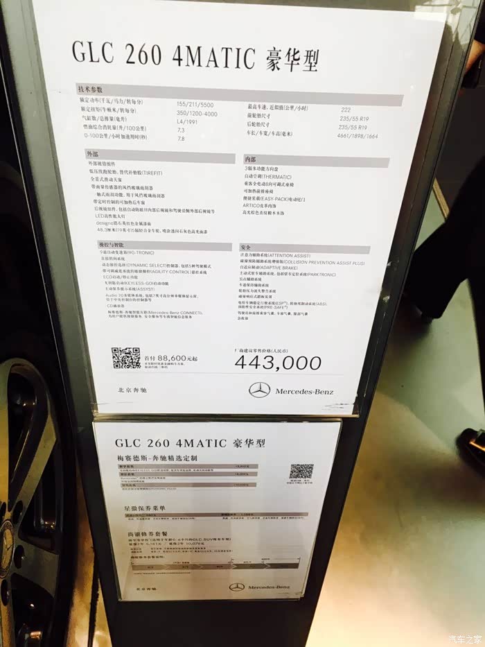 订车时GLC刚上市不久,展车也刚到店,火到没朋友,销售谈价也直接了当,加两万现金提现车,订车不加钱也可以,排队等...时间不限!最后综合考虑 选择了260豪华型,车还是主要母亲大人用,豪华型安全配置多些也放心些!最后车订了那就等吧。那之后,我比爸妈都激动,有事没事儿逛逛论坛看看其他朋友的提车作业,各种研究,偶然发现居然没有无匙进入(差点被无匙启动骗了),得选装,一直以为这俩功能是一起的,马上电话爸妈,都觉得其他配置可以少,无匙进入必须有,这功能很实用,每天都在用. 由于LZ当时身在腐国,只能电话讲解给爸妈,第二天他们找到销售要求选装,但销售小蒋无奈告知可以选装,但提车至少得16年4月以后,而且选装包也不确定.最后约定只要加了舒适进入包的车,不管是只加了这一个包还是三个包全选了都要,结果这一等就是八个月,幸亏家里还有车倒也不急着提.期间也有过车,只是一定要灰外咖内,所以放弃了白外黑内 红外咖内的车源,只能说灰色太少了!