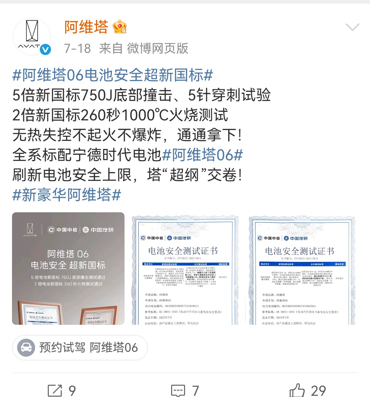 值得一提的是,阿维塔06的纯电和增程在5月份就过了新国标的测试,是宁德时代拿去检测的,增程的逍遥增混电池还有纯电的神行电池,都是过了的,而且最近阿维塔自己也做了了5倍新国标的测试,全部通过,非常让人安心,即使去超充,也不用担心!