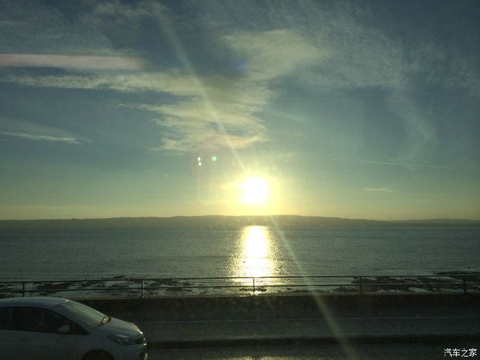 旅游大巴沿着大西洋沿岸前往目的地,初升的太阳照在大海上,给人非常温暖的感觉。