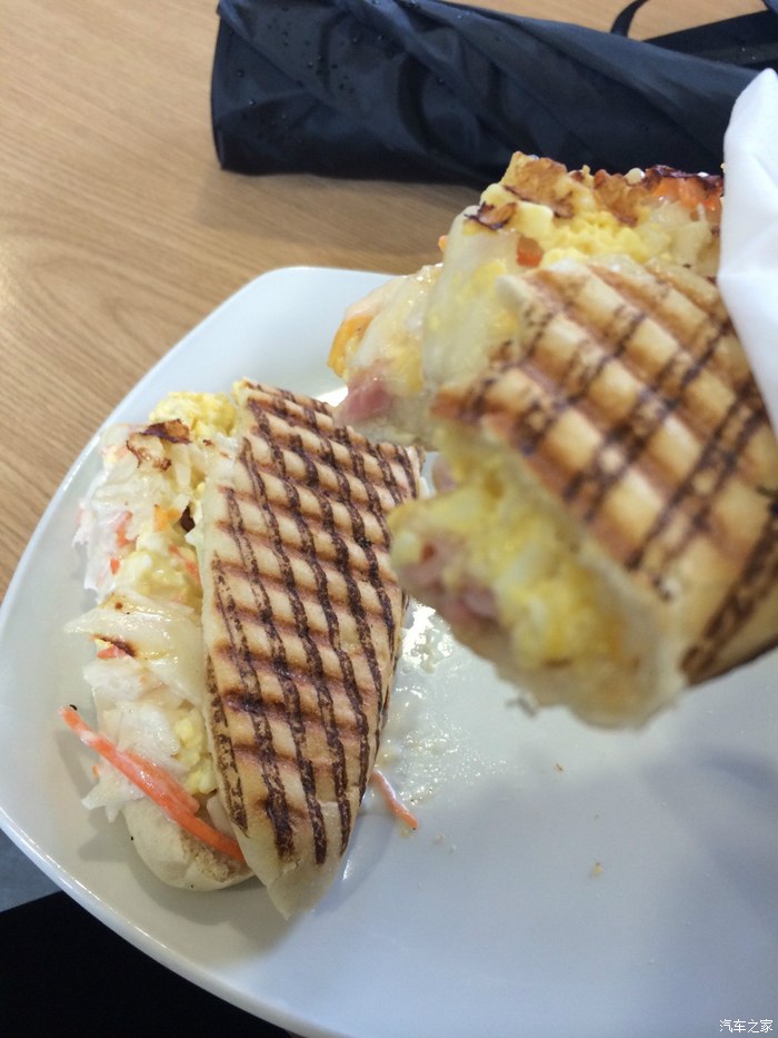 在船厂吃的午餐,里面是起司、鸡蛋、蔬菜沙拉和培根,烤完以后味道还不错。