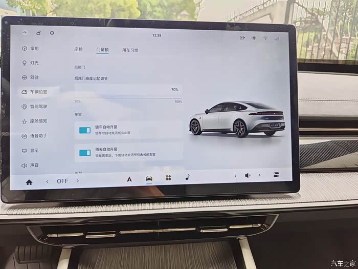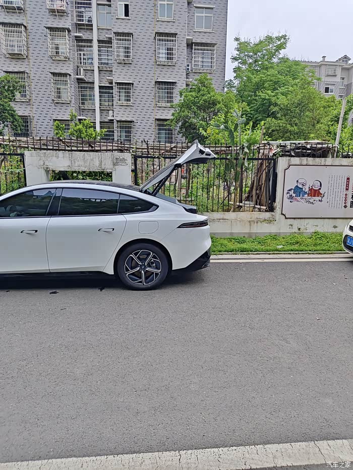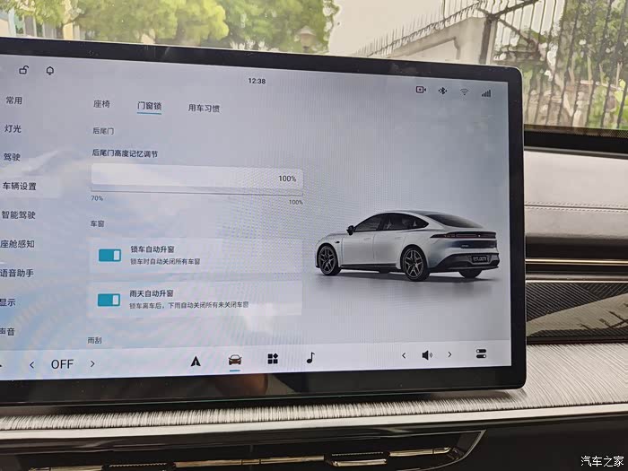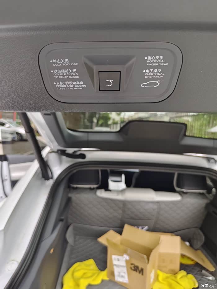 特别值得一提的是,后备箱的开口高度是可以在车机端进行控制的,我给后备箱开启高度100%和开启高度设置为70%时分别拍了照片供大家参考。另外,最后的这张照片的按钮,双击的时候可以延时关闭后备箱,大概20秒左右,我暂时还没有使用到这功能,如果需要从后备箱拿东西离开的时候可以提前双击这个按键,就不用把东西拿出来后再特意回来关后备箱了。