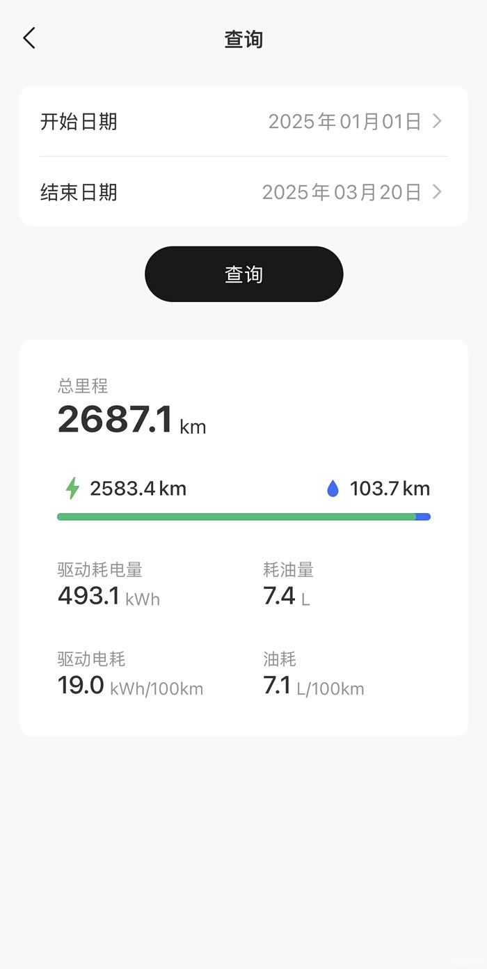 油耗:用油行驶103.7公里,综合油耗是7.1L/100km,这个油耗还是非常不错的,车大又重,我还是满意的,日常根本用不到油,这103公里是因为油箱里面的油已经过期了,所以把用掉,不然用油行驶是0公里。用车成本还是蛮省的。