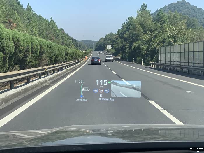 超大的HUD,非常实用又方便,视线的正前方正好可以看到,显示的很清晰,显示的内容也很丰富,有智能驾驶的信息,有车道实时的影像,还有地图的显示,确实很高大上。