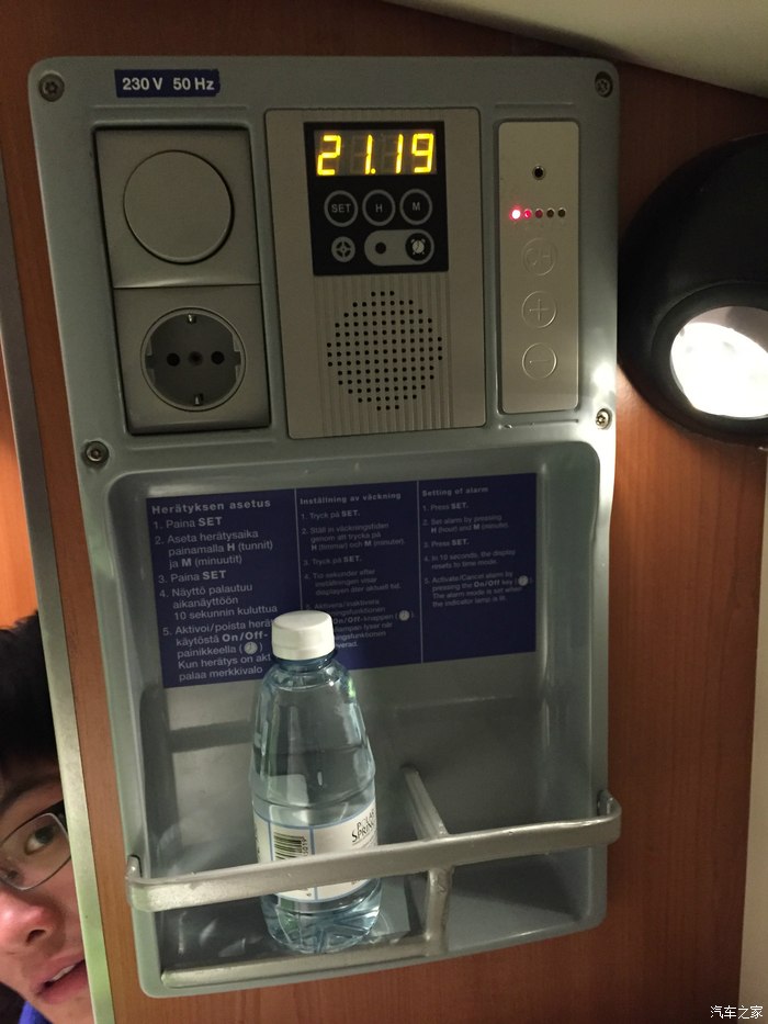 这算是床头柜吧,有闹钟,电源,照明灯,音响,还有赠饮。小伙伴不小心入镜。