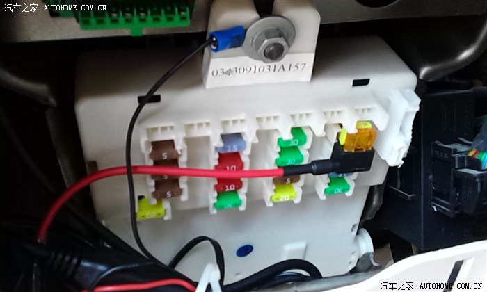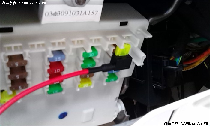 *********接下来,自己一个人操作,没法拍照 ,反正就是把线从后视镜,经由前档缝向左转到A柱饰板里面,再从下面穿入保险盒内。35度的高温,搞的我满头大汗啊~~*********