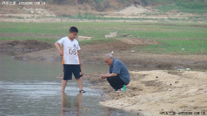 都起床了,在河边溜腿。水边的祖孙2人,在寻宝。