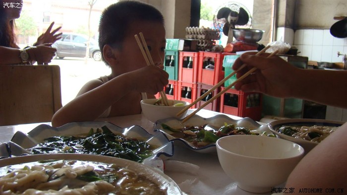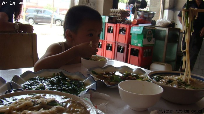 到达了一个小镇上,点了3个菜,要来2份面条,这里的人太实在了,我们要的小碗,上来是这么大碗,这一碗够我一家人吃了。
