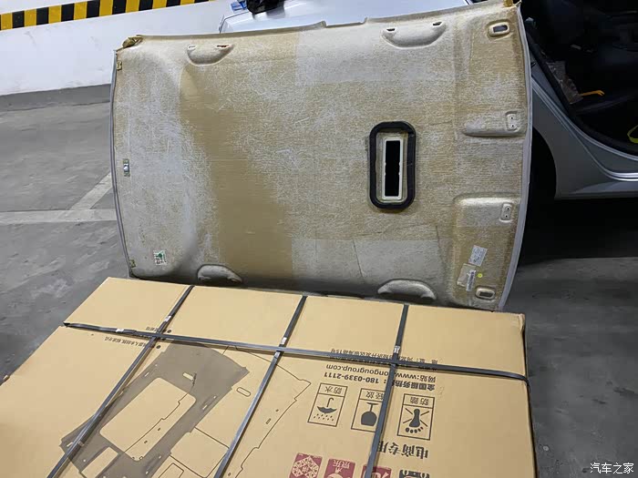 年头太长了就会脱。顶棚拆下来,买桶万能胶和刷子,买块韧性强的布,自己粘上就行了。通风晾干没味。