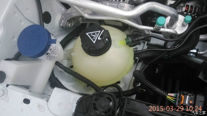 检查油液,蓝盖的是玻璃水,黑盖黄色的是发动机冷却液
