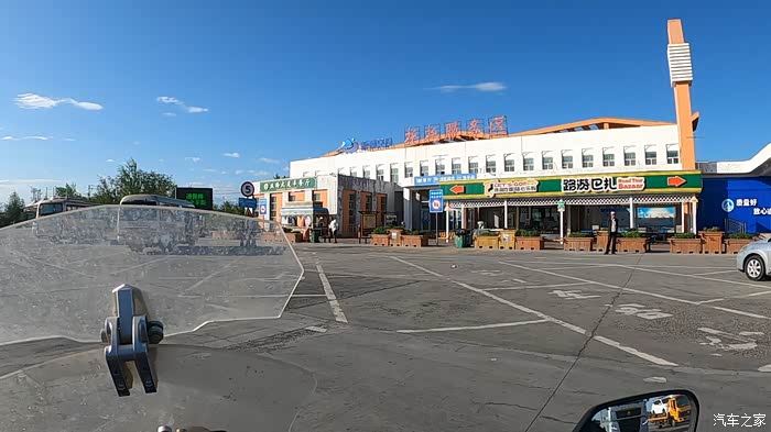 乌兰县加油站很特别,摩托车离加油机有一段距离,必须停在规定的位置里