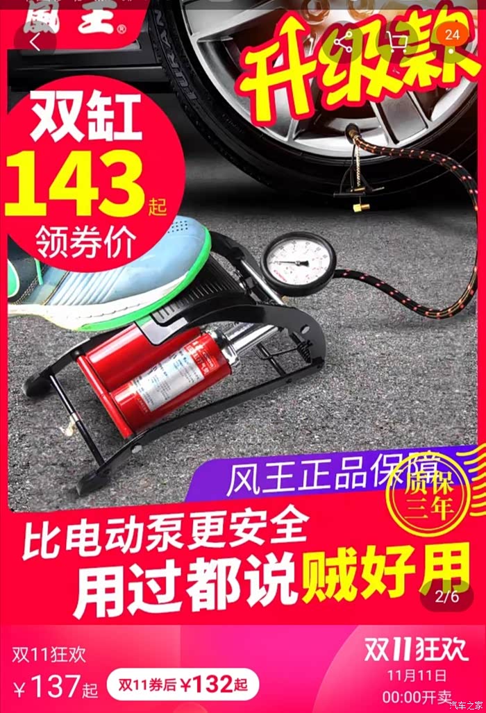 我买了这种优质的双缸(比较贵),2.1踩到2.4大约10下,表显很准。车自带胎压检测,胎压低一点,踩3~4下就行了。