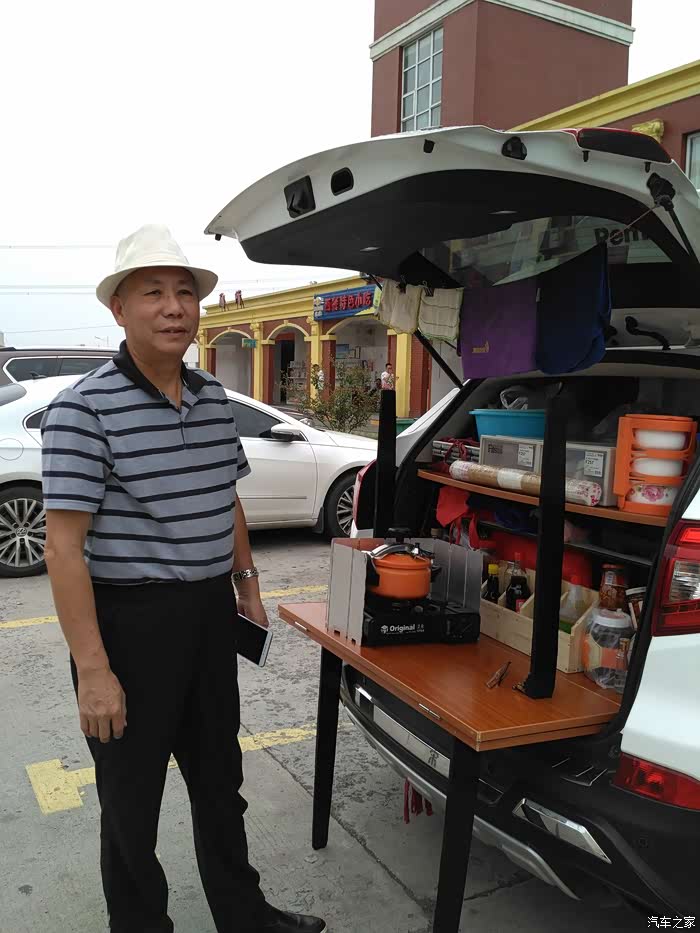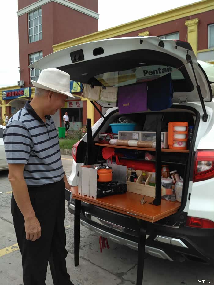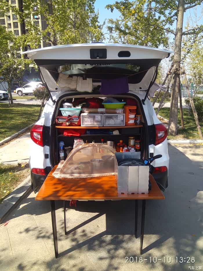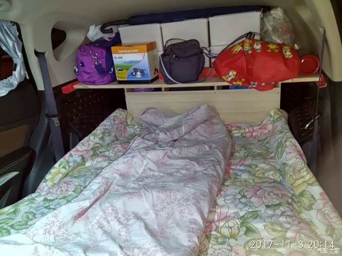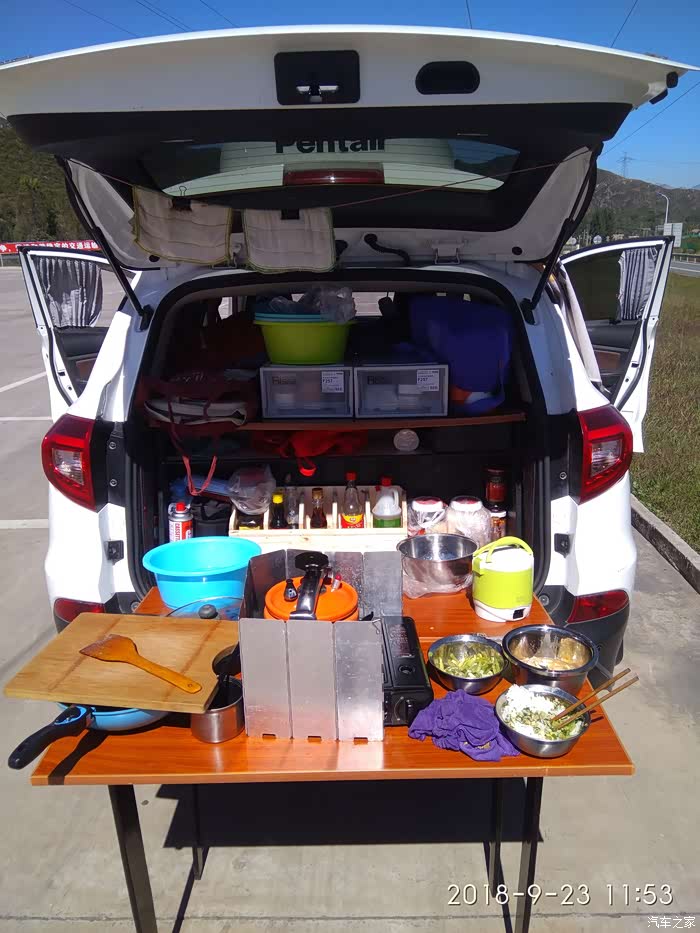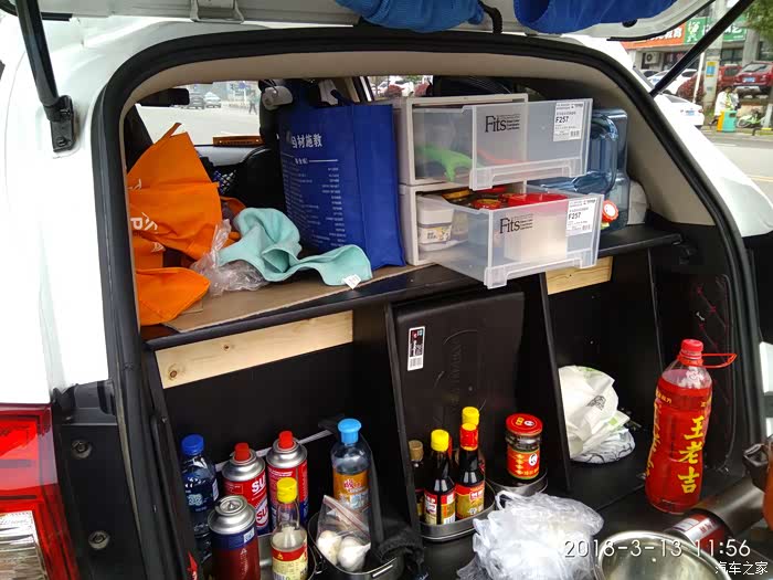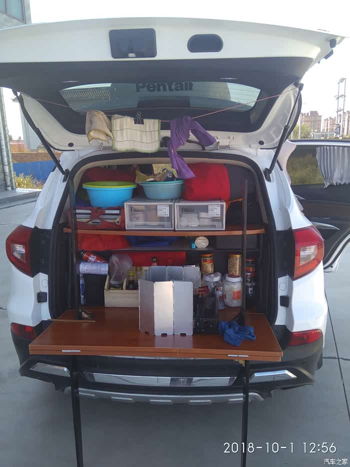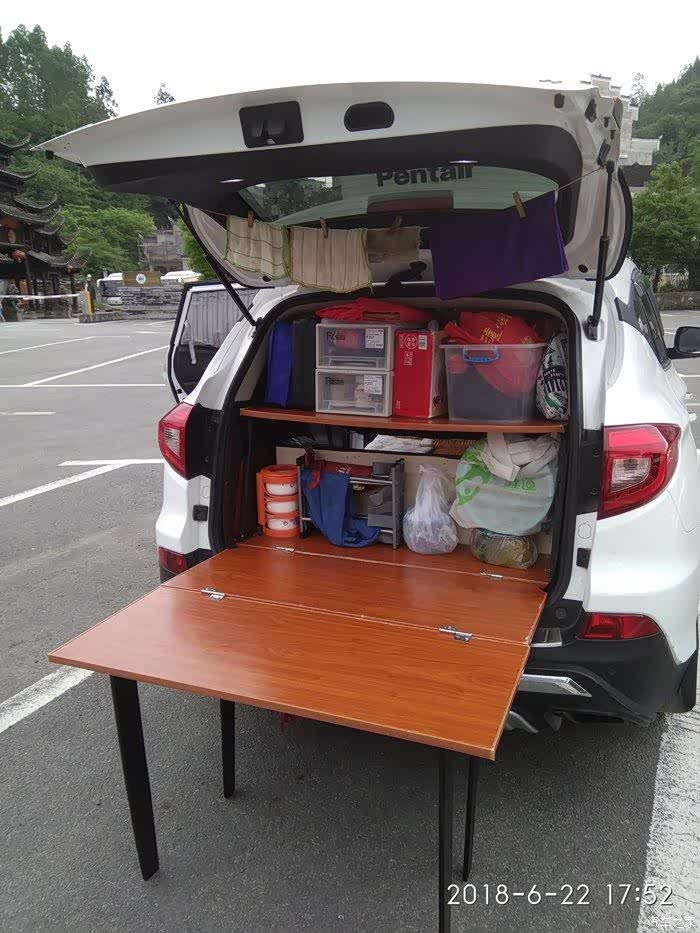最近连续几年远距离自驾穷游,而且是在车上吃住,感觉做饭的环境应该改进一下,我买过二个小床桌,也买过四椅连桌饭桌,今年又换过折叠桌,多次使用后感觉收放是个大事,体积大占地方,搬上搬下费劲。今年7月,49天新疆南北环游回家后,我又做了改进,上部设置六个抽屉箱,下部设置三个置物箱区,一是暖瓶区;二是炉灶区;三是锅盆区;置物箱根据尾箱斜度制做,下宽上窄,占用空间约30公分,高度42公分,长度一米,箱门为一米长,42公分高,安上铰链,装2个折叠撑杆连接,倒下门板就是一100X40的案板,经过试用,还行!外出不用带桌子了,也不在地上和车头做饭了,现将改进的床车汇报给大家,请多指教。