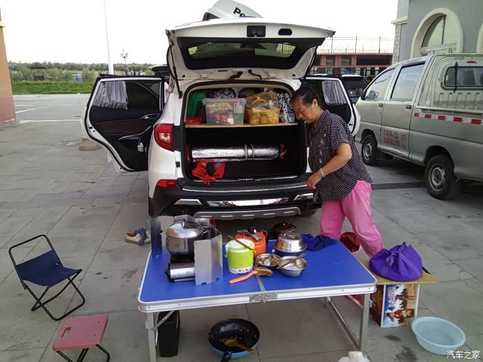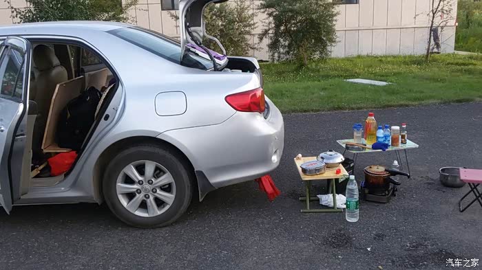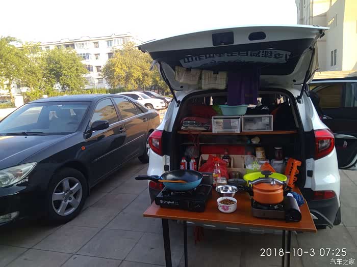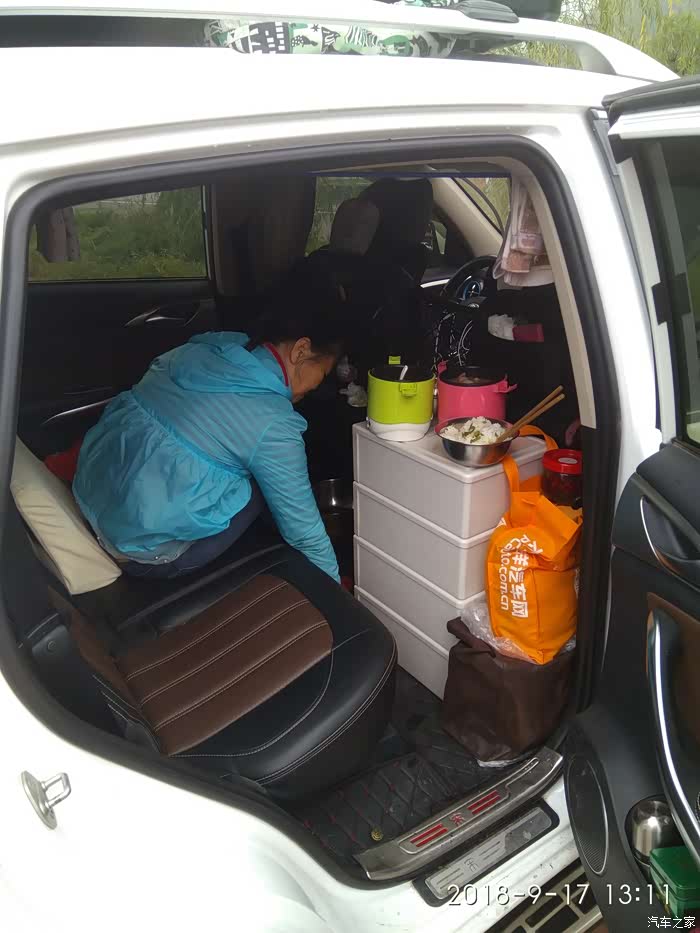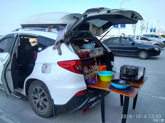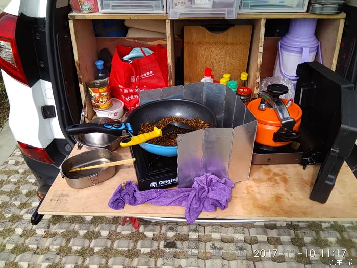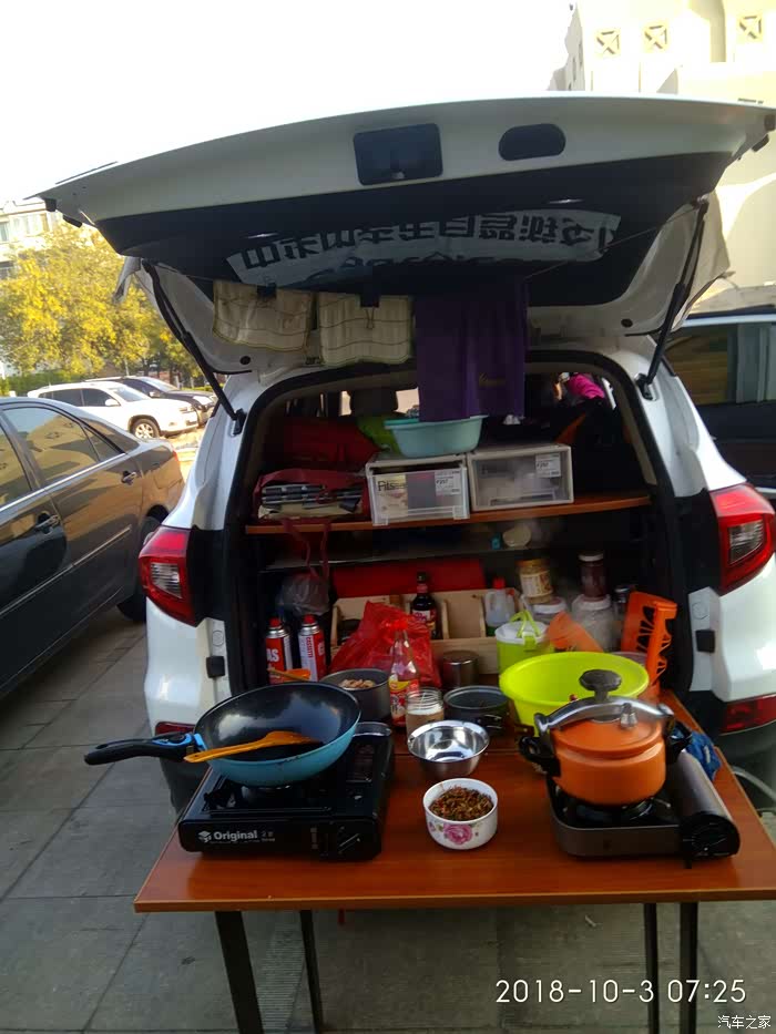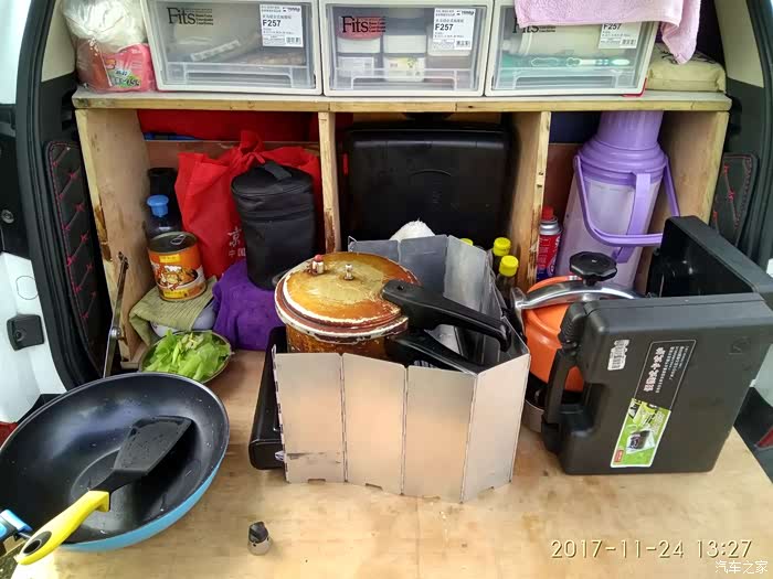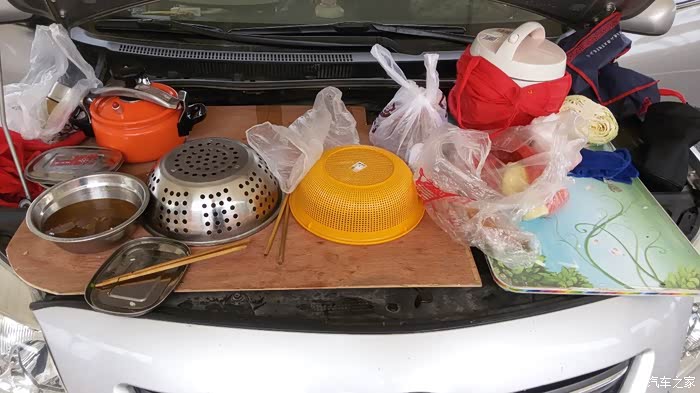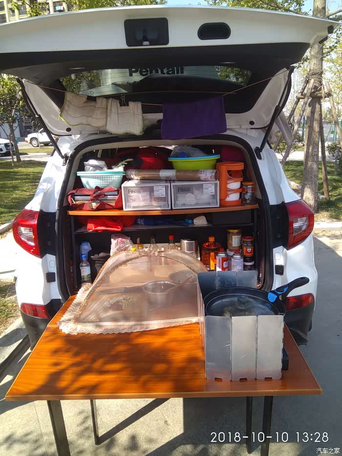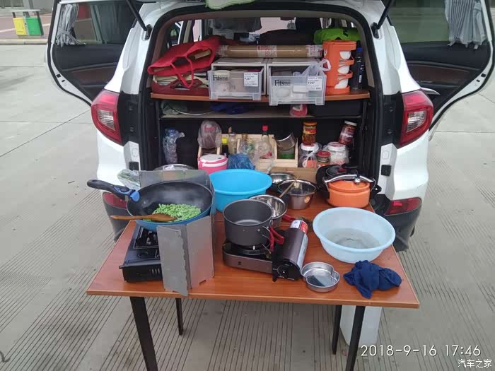 最近连续几年远距离自驾穷游,而且是在车上吃住,感觉做饭的环境应该改进一下,我买过二个小床桌,也买过四椅连桌饭桌,今年又换过折叠桌,多次使用后感觉收放是个大事,体积大占地方,搬上搬下费劲。今年7月,49天新疆南北环游回家后,我又做了改进,上部设置六个抽屉箱,下部设置三个置物箱区,一是暖瓶区;二是炉灶区;三是锅盆区;置物箱根据尾箱斜度制做,下宽上窄,占用空间约30公分,高度42公分,长度一米,箱门为一米长,42公分高,安上铰链,装2个折叠撑杆连接,倒下门板就是一100X40的案板,经过试用,还行!外出不用带桌子了,也不在地上和车头做饭了,现将改进的床车汇报给大家,请多指教。