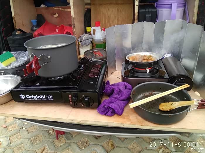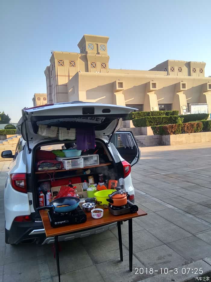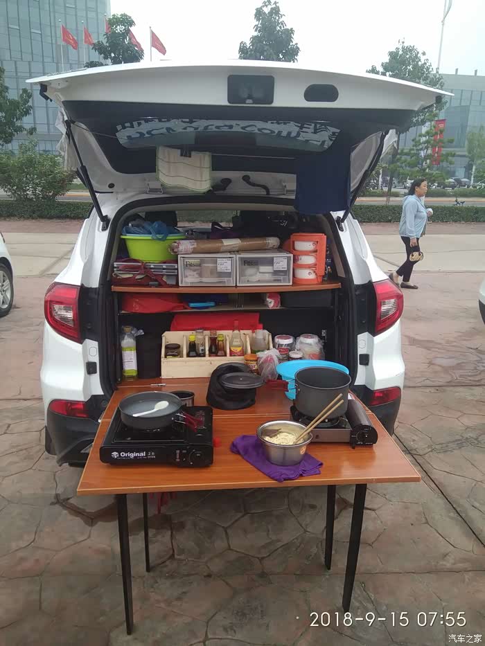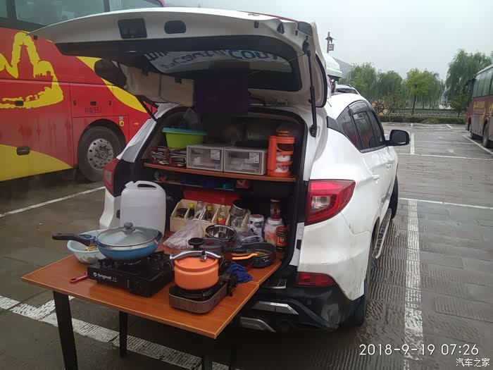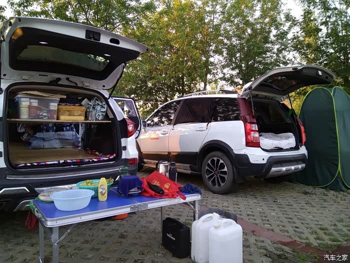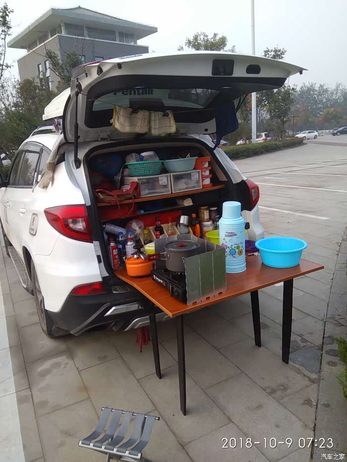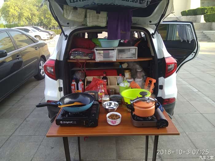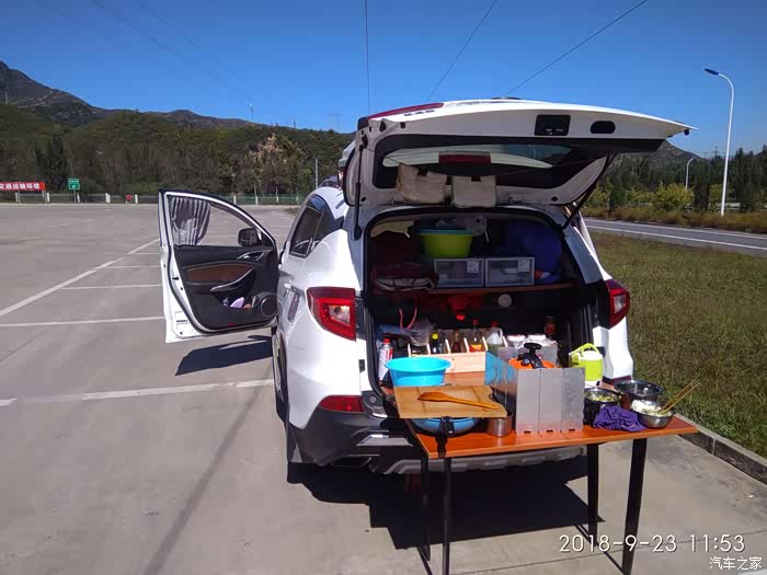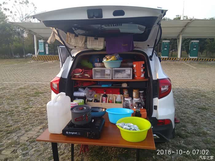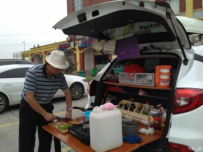 最近连续几年远距离自驾穷游,而且是在车上吃住,感觉做饭的环境应该改进一下,我买过二个小床桌,也买过四椅连桌饭桌,今年又换过折叠桌,多次使用后感觉收放是个大事,体积大占地方,搬上搬下费劲。今年7月,49天新疆南北环游回家后,我又做了改进,上部设置六个抽屉箱,下部设置三个置物箱区,一是暖瓶区;二是炉灶区;三是锅盆区;置物箱根据尾箱斜度制做,下宽上窄,占用空间约30公分,高度42公分,长度一米,箱门为一米长,42公分高,安上铰链,装2个折叠撑杆连接,倒下门板就是一100X40的案板,经过试用,还行!外出不用带桌子了,也不在地上和车头做饭了,现将改进的床车汇报给大家,请多指教。
