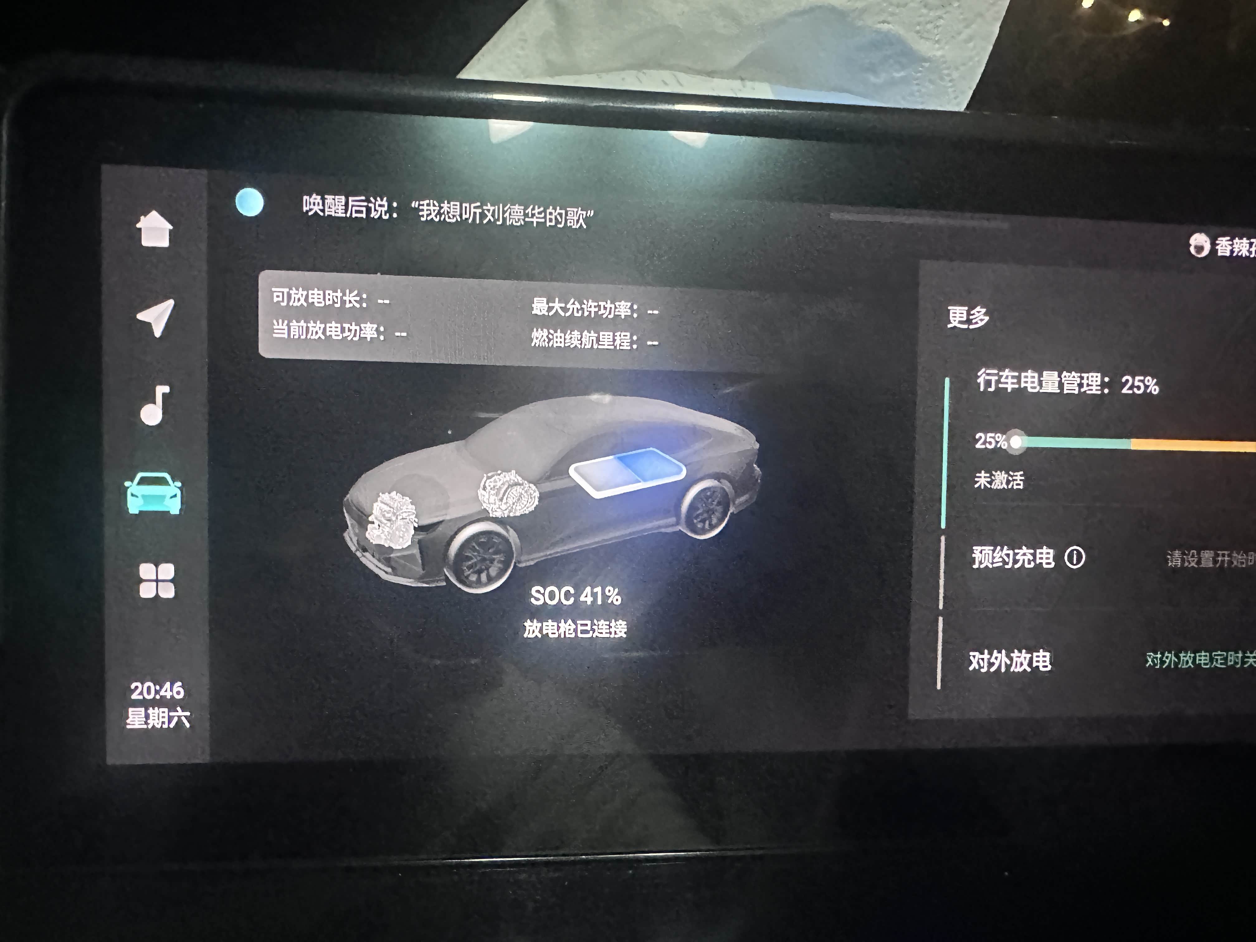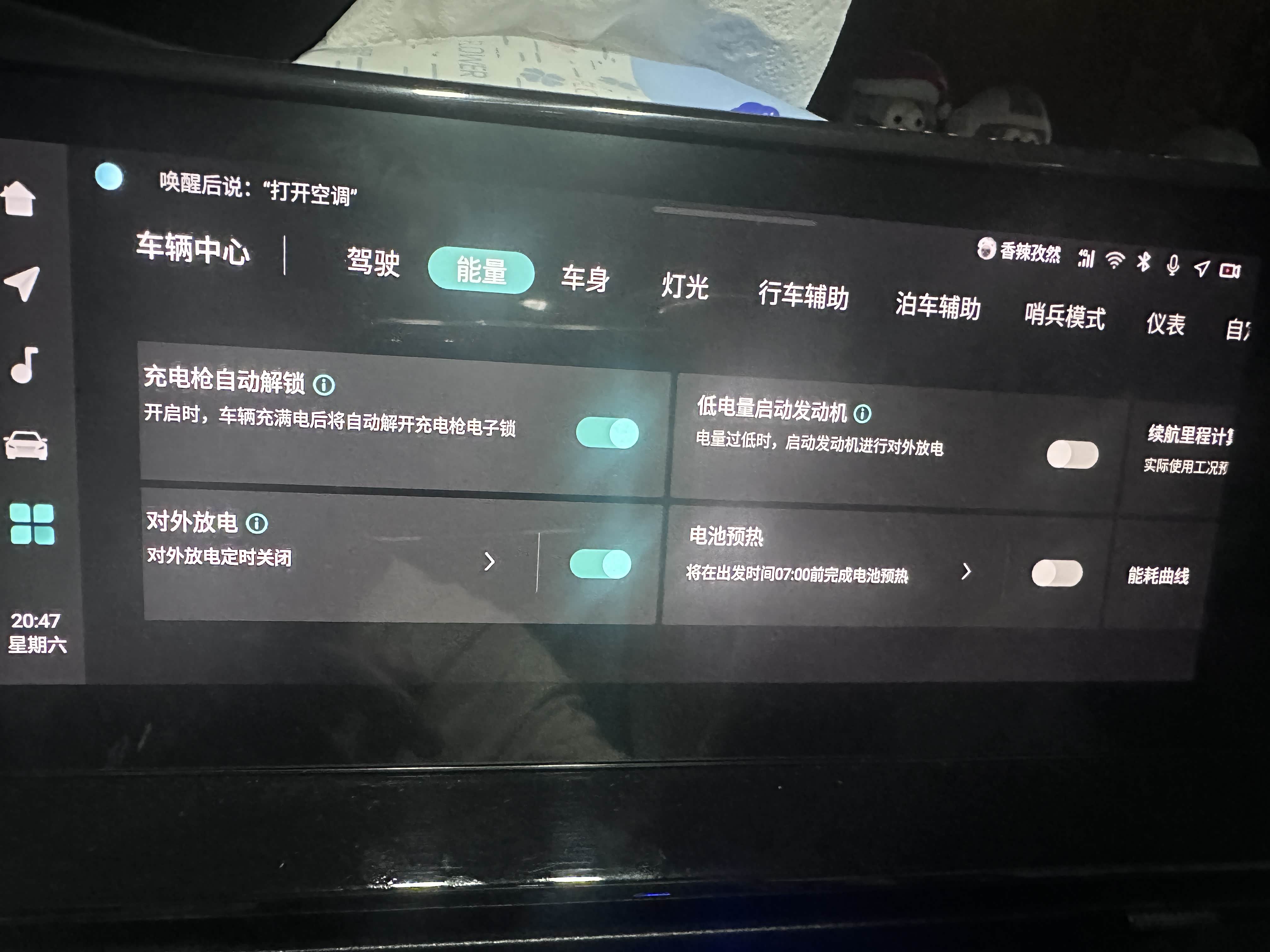 3.中控屏→车辆设置→放电模式