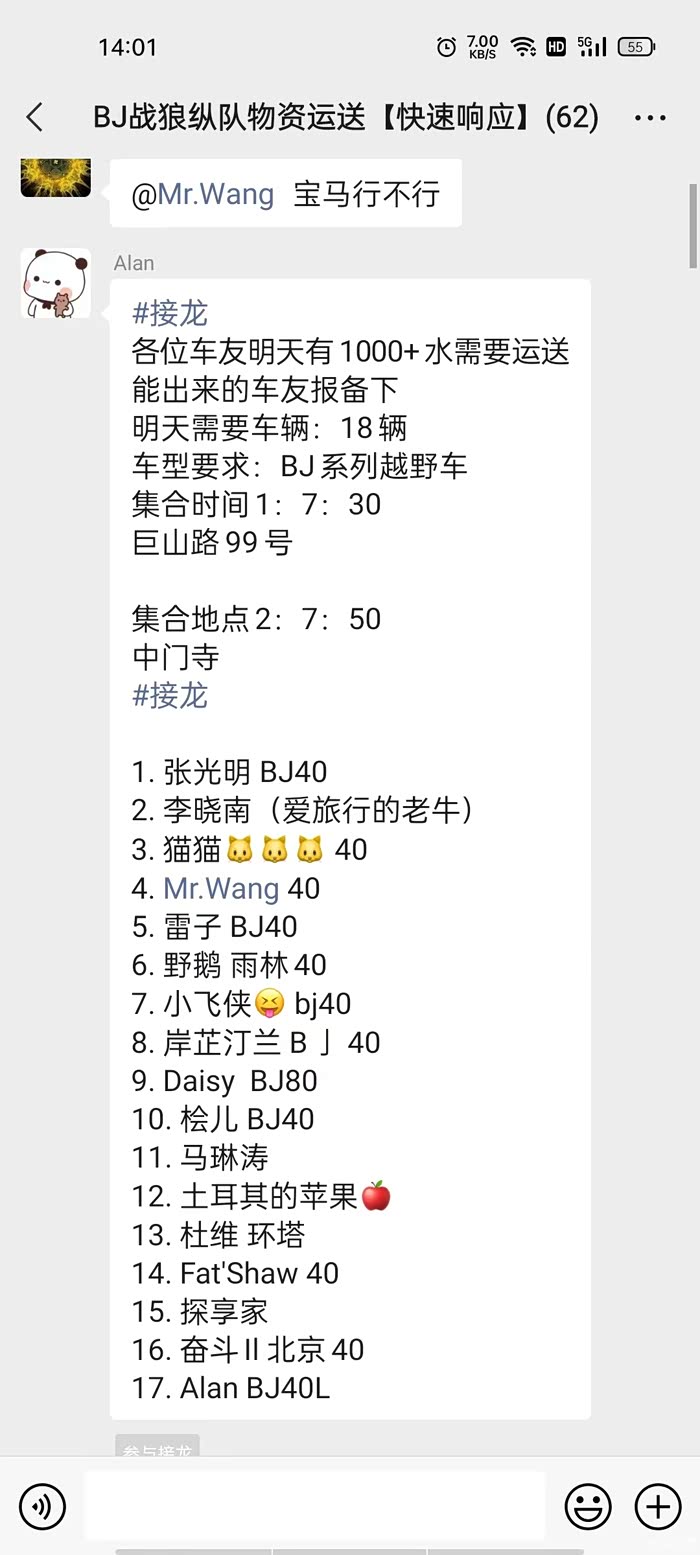 紧急联系了咱们BJ战狼纵队的会长光明,招募车友参加救援,做一些我们力所能及的事儿