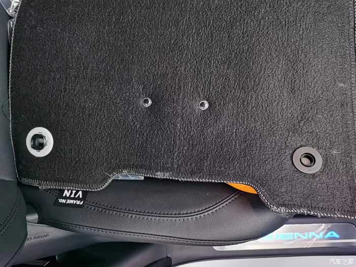 赛那前排座椅下边是翻毛皮,考虑到脏了比较难清理,所以买了一套防踢垫。防踢垫一般有两类,一类是金属硬质的,另一类是软质的。我不太喜欢硬的质感,而且觉得硬质的可能不如软质的服帖,所以选了软的。安装方式是直接用魔术贴粘上去的,粘的比较牢固,也挺服帖,可以入手。
