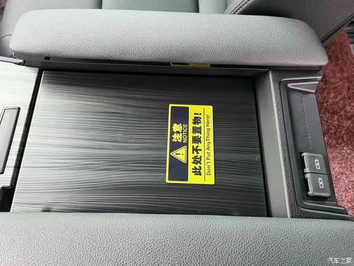 赛那拥有一个超大超实用的扶手箱,但是这个扶手箱设计上有个问题,那就是打开时容易导致放在盖子上的物品滑入到旁边的缝隙中,尤其是卡片之类的小物件。并且,东西一旦掉进去就很难取出,需要到4S店把整个扶手箱拆开才能拿出来,麻烦不说,还要花上几百块的工时费。为了防止因为疏忽而出现这种情况,我在某宝上定制了一个警示贴,贴在了扶手箱盖子上,起一个警示提醒作用。警示贴是用亚克力双面胶粘上去的,不要的时候可以轻松地撕下来,不留痕迹。