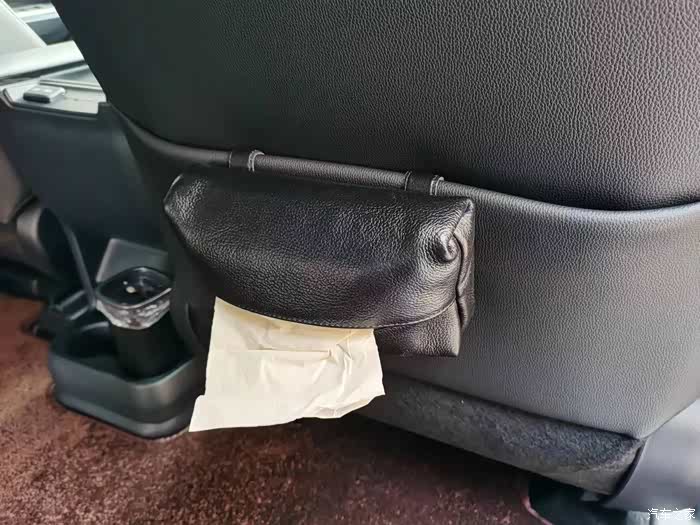 车载纸巾盒我买了两种,前排买的是这种专门用在水杯架上的筒装纸巾,缺点是纸质一般,比较薄,欠柔软,稍微有点油墨的味道。还有就是纸筒比较轻,抽纸的时候容易把整个纸筒带起来。至于二排的纸巾盒,其实觉得装在前排头枕上用着比较顺手,但是因为头枕上装了小桌板和衣架,所以选了一种带背夹的,挂在椅背袋上,材质是真皮的,手感不错,看起来也算有档次,可以入手。这种纸巾袋比较薄,适合装3层80抽以下的纸巾。
