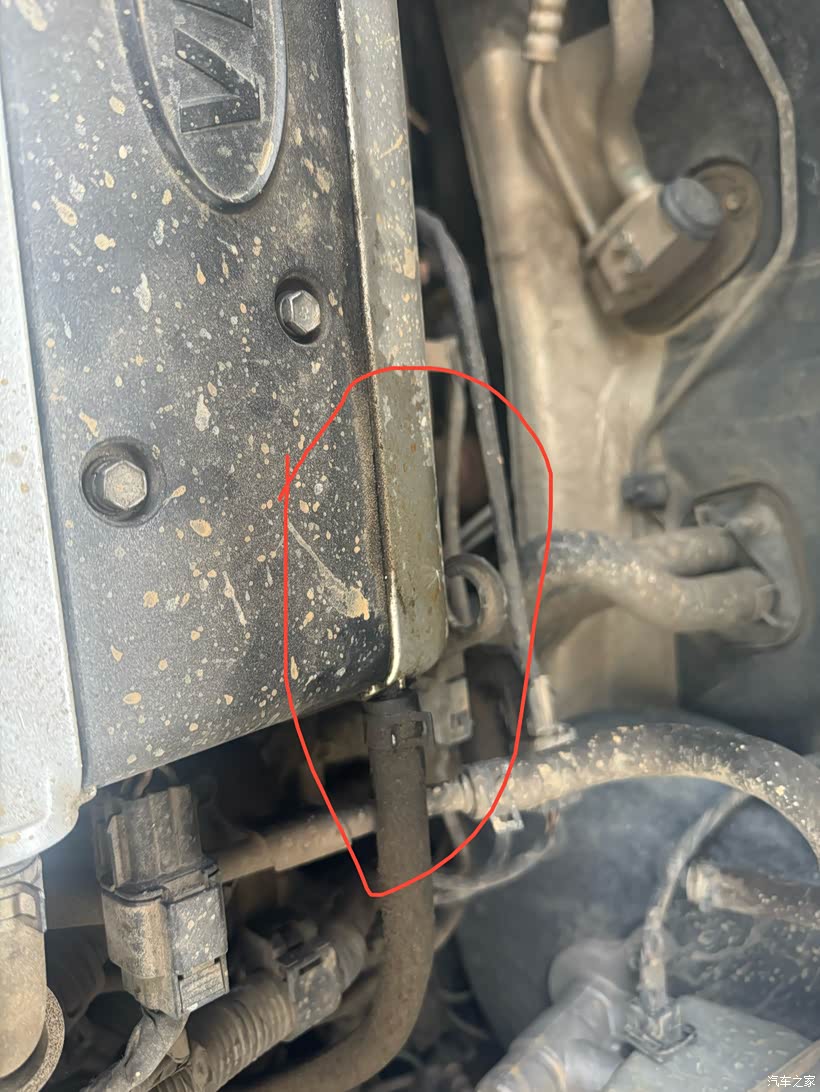 这根好像是废气管,机油蒸汽喷出来很正常。先擦干净开两天再看看,如果还喷得厉害,可能是气门室盖垫或者废气阀有点问题,得检查了。