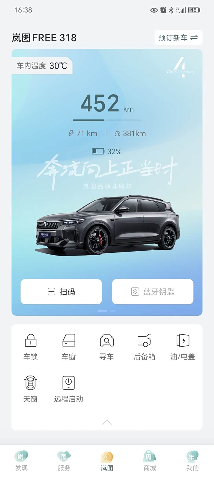 提车已经一个星期了,聊聊使用感受。最大的感受是车的操控感很好,很舒服,4.9车长掉头转弯都很轻松,底盘很稳,有开豪车的感觉,有一点不方便的是车身比较大,停车不太方便,用过几次自动泊车,简单的车位可以用,我家停车车每次进去识别到地上车锁就停止了。车机系统比较清爽,语音指令完全够用,不支持安装外部软件,可以支持提前远程启动车辆,但好像没有哨兵模式。前排座椅有通风按摩加热,还有调节腰托,车内有小憩模式,在单位我每天都是在车内午休,还是比较舒服。我到上班的地方近三十分钟车程,开了三天,电量从90%到30%,包括每天午休两个小时用电。电量足的情况下,燃油模式4.5L/100KM左右,保电模式下车内还是听的到发动机声音。跑过一次高速,体验了一下自适应巡航还可以,高速上燃油模式跑起来动力很足。还有岚图软件上有自家商城,所有原厂东西明码标价,比较好,就是价格贵点。