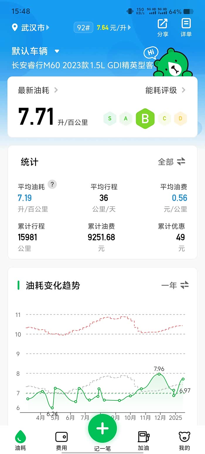 原厂状态跑了1.6万公里,油耗平均7.2左右,最高不到8!武汉市区孝感市区随州市区。